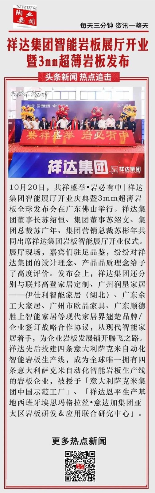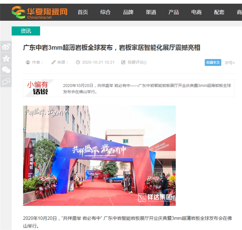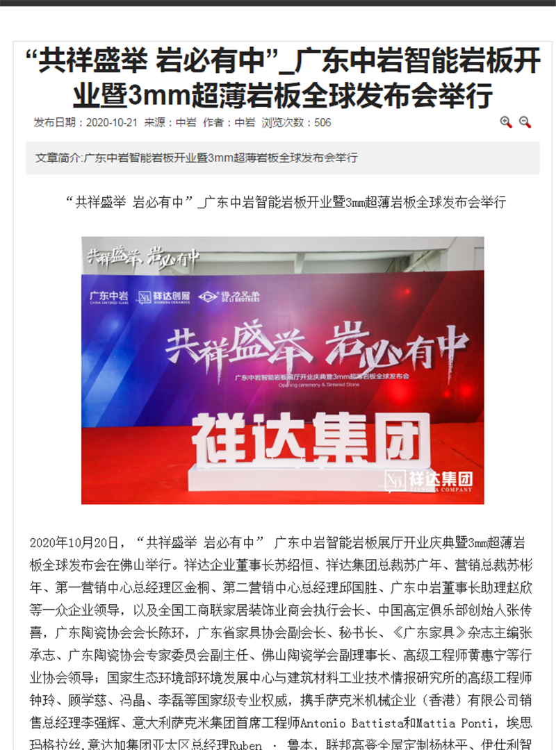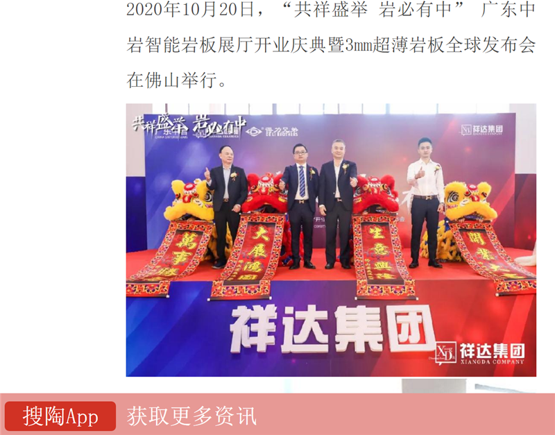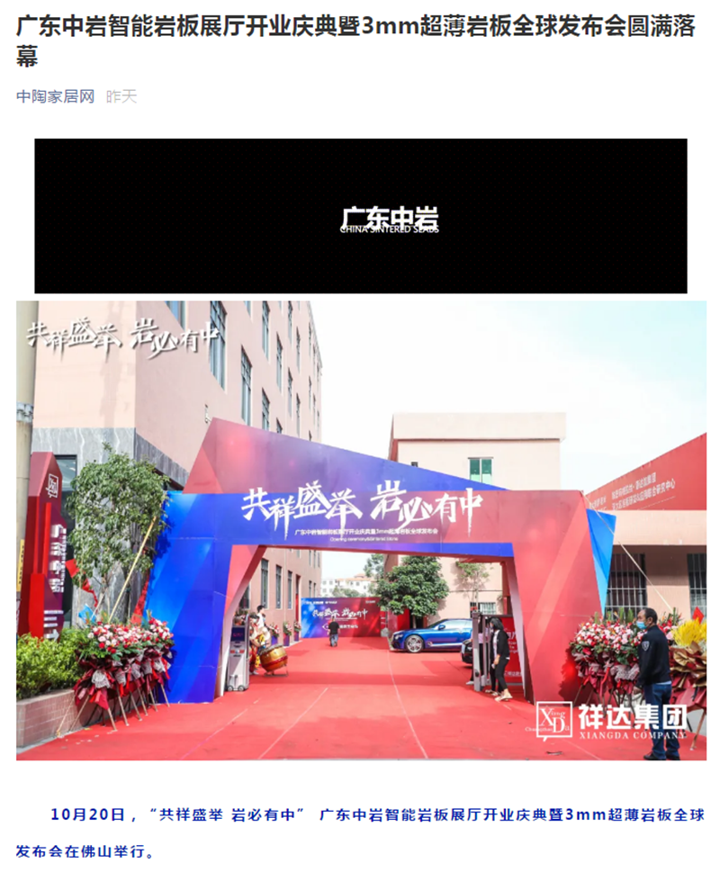 10月20日,“《共祥盛举 岩必有中》广东中岩智能岩板展厅开业庆典暨3mm超薄岩板全球发布会”吸引了40多家媒体莅临活动现场,作为中国岩板发展的风向标,正式披露的一系列新装备、新技术、新产品、新模式受到媒体们的广泛关注,再次掀起岩板行业新的发展风潮。