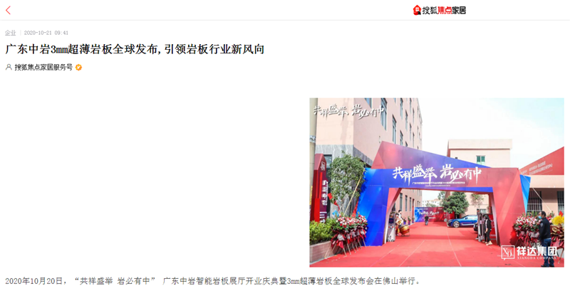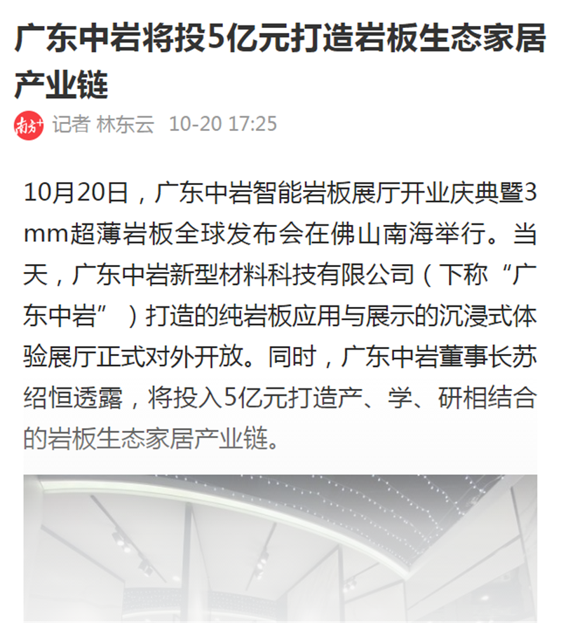 主流媒体对广东中岩的快速发展和惊人增长速度表示吃惊,感叹中岩岩板智造产业大好未来,广东中岩岩板不仅引领中国岩板智造的发展方向,自身也已迅猛成长为中国岩板行业生产智造的巨擘企业。
