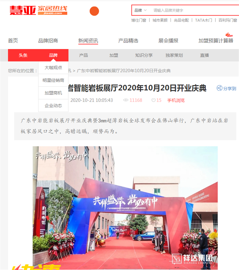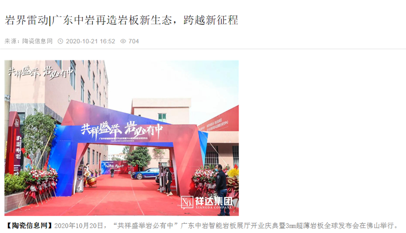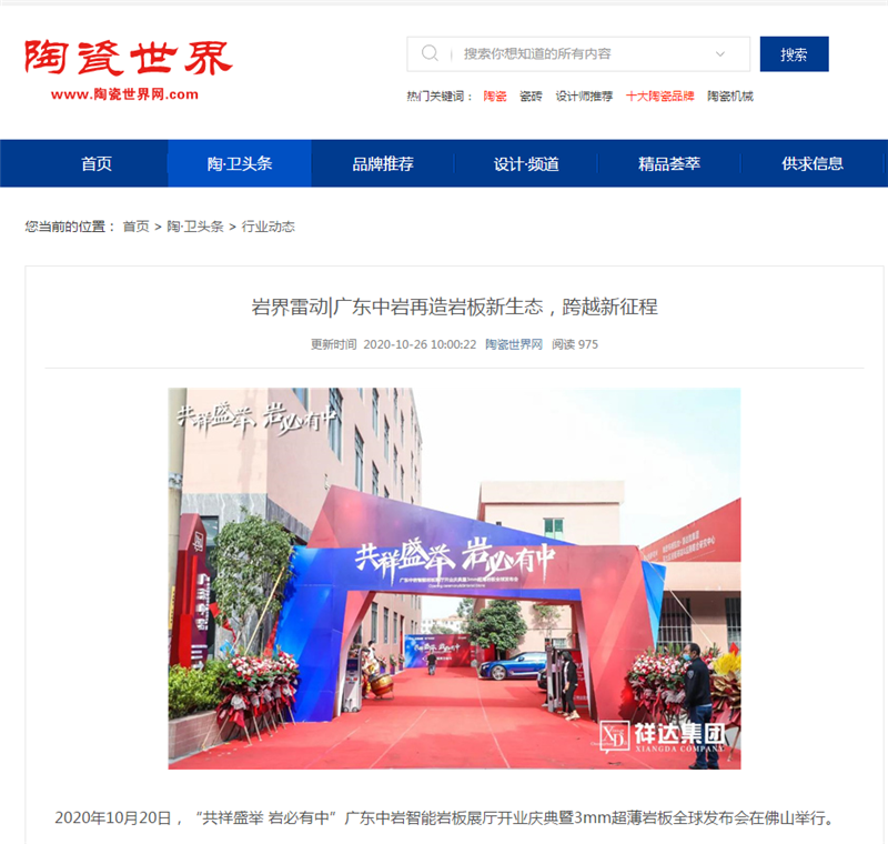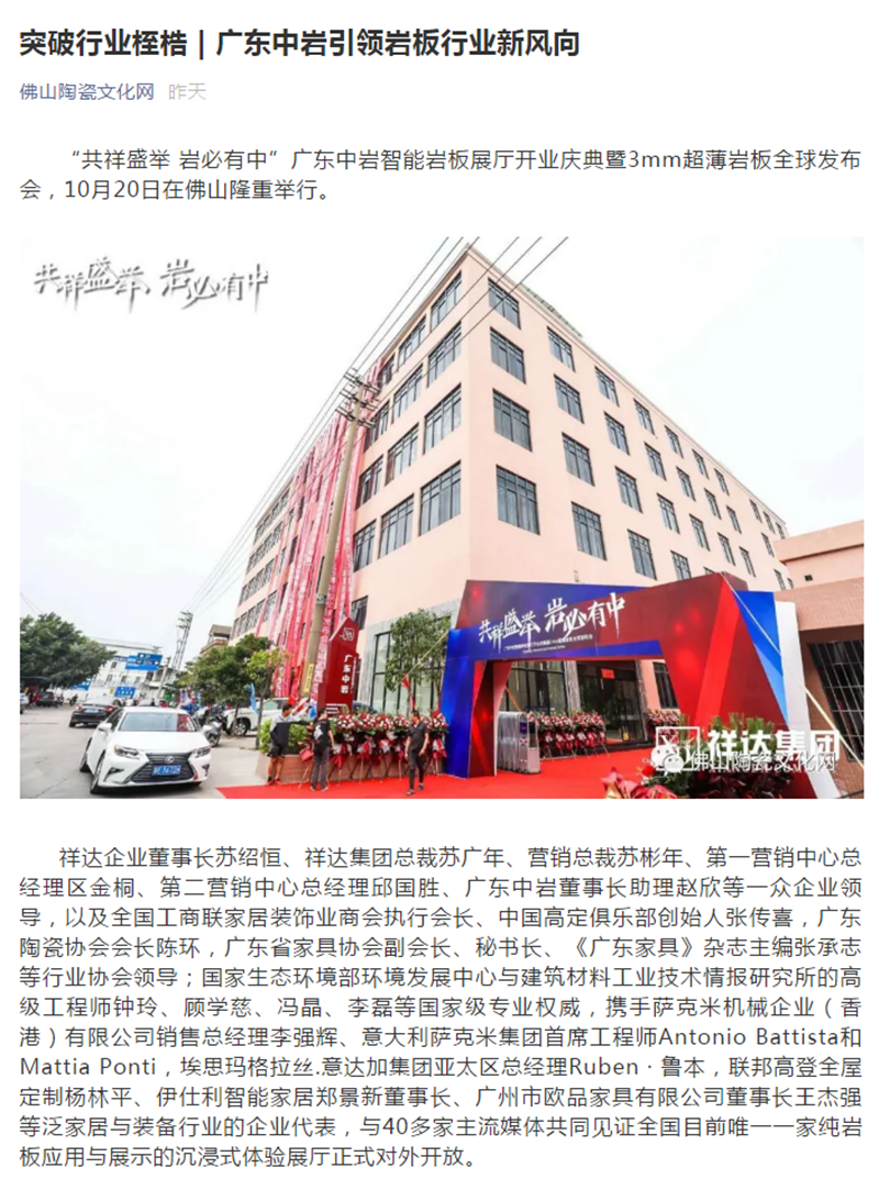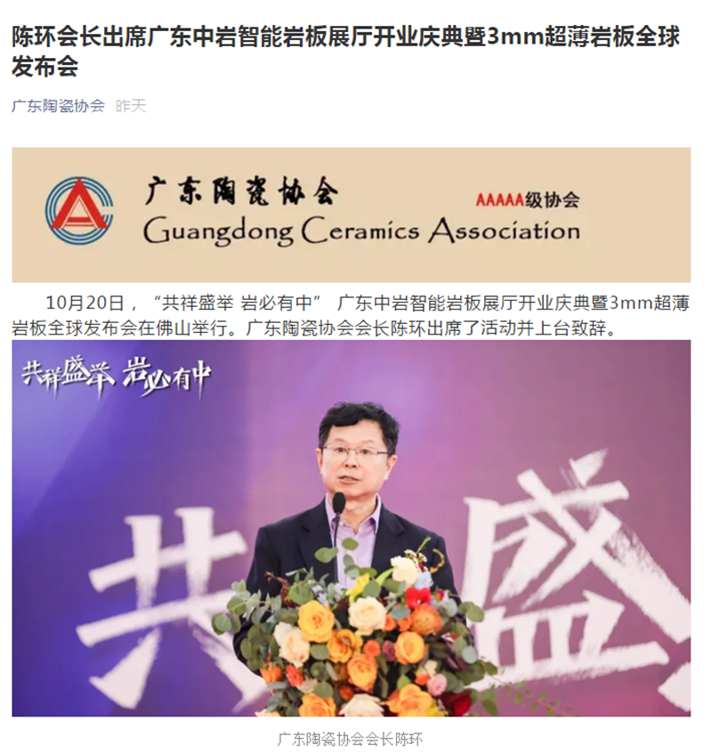 广东陶瓷协会媒体平台也给予广东中岩此次盛会极大的支持和关注,广东陶瓷协会会长陈环作为领导嘉宾亲临现场助力,行业媒体平台的发布充分的展现行业对广东中岩发展的肯定和推崇,并对广东中岩为行业做出的积极贡献表示极大赞许。