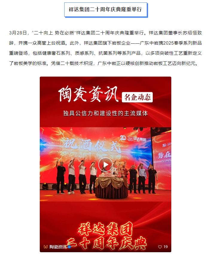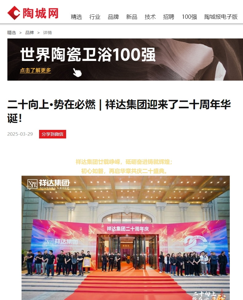 2025年3月28日,《二十向上,势在必燃》祥达集团二十周年盛典活动在万众瞩目中完美谢幕,在这个意义非凡的日子里,宾朋满座,共同回顾祥达集团二十载的奋进征程与辉煌成就。来自全国的供应商、经销商、合作伙伴、行业媒体/协会、社会各界嘉宾以及祥达家人们,欢聚一堂,跟祥达一起燃势、升维、跨越!